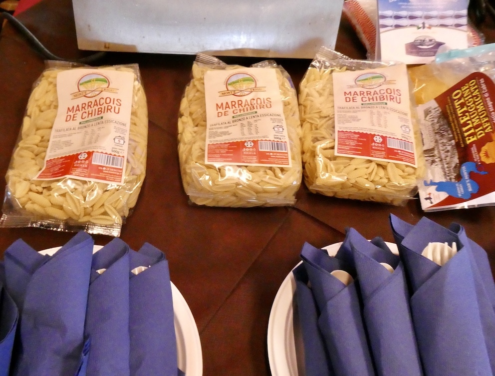 Als Pasta hatten uns für Malloreddus entschieden und nicht für die für dieses Gericht eigentlich üblichen Spaghetti. Denn Spaghetti von Probiertellern auf einem Zuschauerstuhl sitzend zu essen, kann durchaus gefährlich sein. Wir wollten nicht, dass der Eine oder die Andere mit Ölflecken auf Hemd oder Hose den Veranstaltungsort verlassen musste. Aber die Zubereitung der Malloreddus alla Bottarga hat auch gut gezeigt, worauf man bei dem Gericht achten muss. Und geschmeckt hat es mit den Malloreddus ebenfalls.